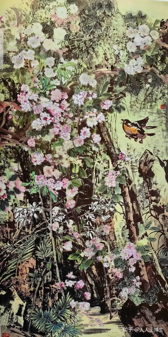 黄文丽 中国画《鸟鸣山更幽》138x70cm