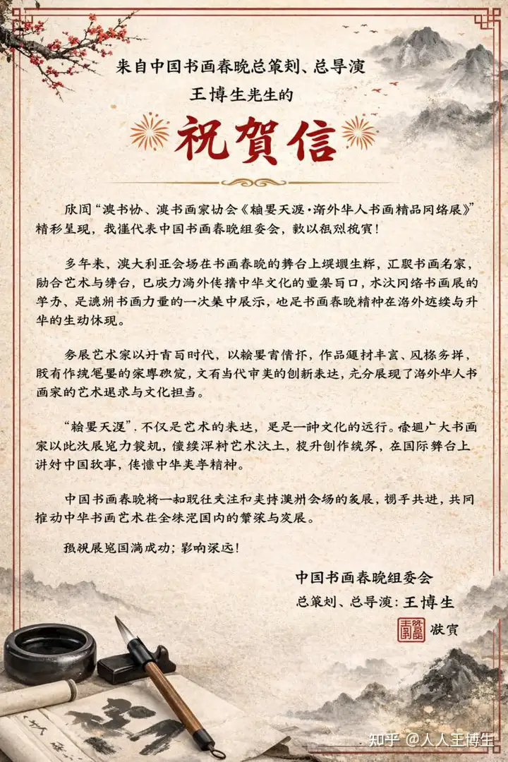 来自中国书画春晚总策划、总导演 王博生先生的祝贺信
