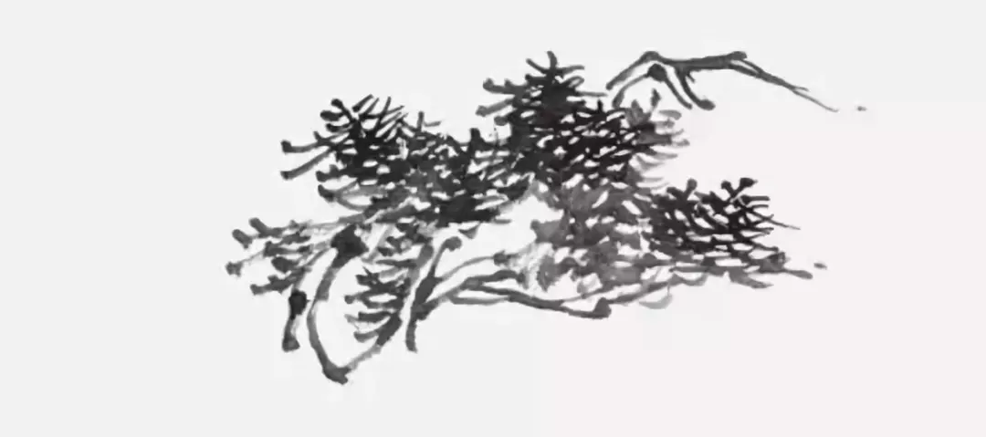 第一步:以中景的松树起势。由上往下的顺序,先勾画出树梢处的松针。注意勾松针用笔应“虚起实落”,笔尖先落于纸上,笔肚后落,这样画出来的松针前尖后钝,很有力度。顺势勾画出树枝,树枝与树叶的穿插要得体。松枝一般都是从节处向四面八方生长开来的,画时要有取舍,可曲可直、可松可紧、可疏可密,分出方位,该让、该避、该前、该后,形成立体,见到层次。此外还要遵循“根粗梢细”的原则。