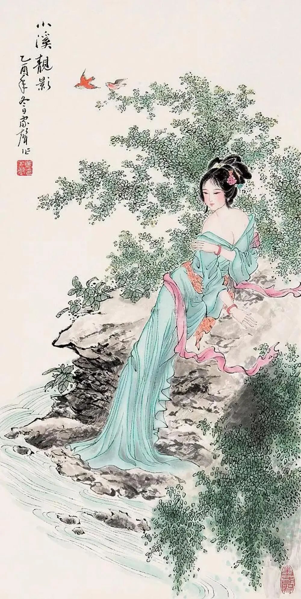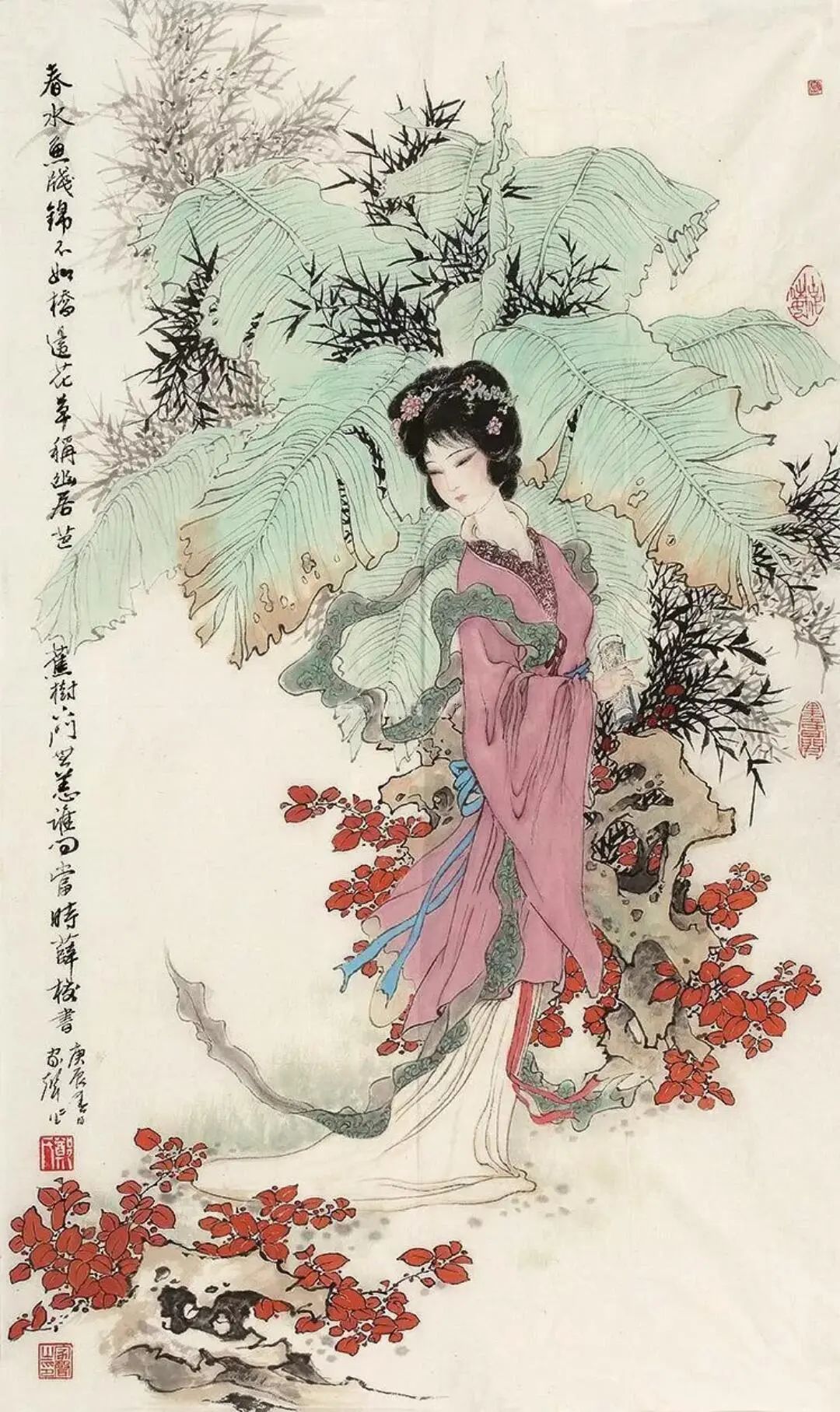 “绿了芭蕉,红了樱桃”在国画中,绿和红常常搭配,冲撞出特有的古典韵味,配上仕女或站立飘逸的身姿,或微微倾斜倚靠石头,惬意慵懒。
