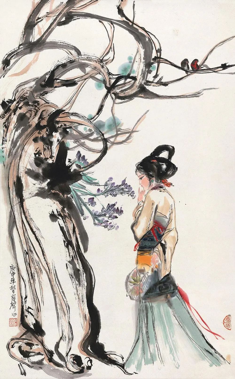 枯树缠绕,盘桓交错,张狂豪迈,本应该死气沉沉,却因为伴生的紫色花朵和两只小鸟,还有女子低眉嗅花的动作,让整幅画都充满生机。
