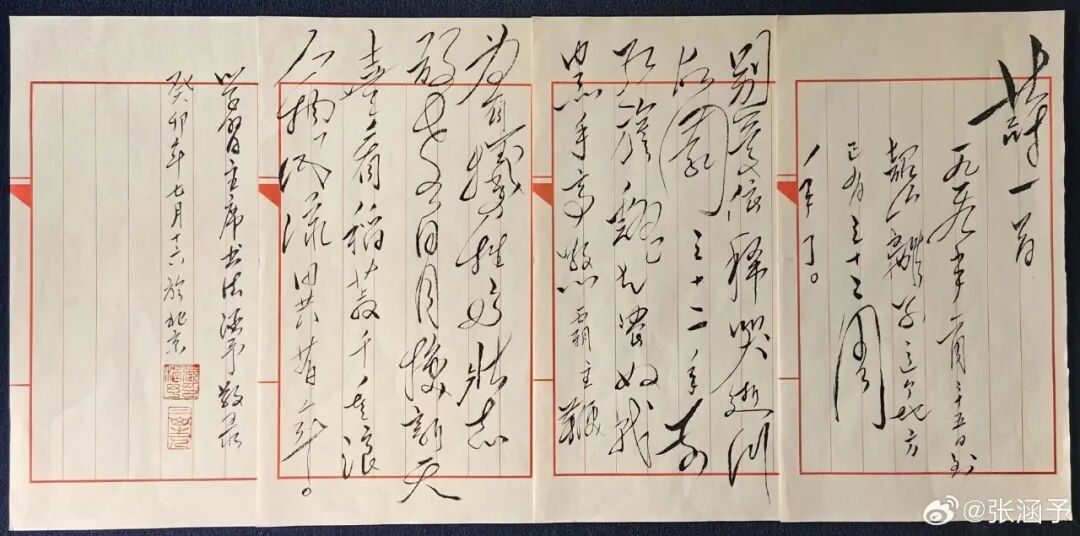 在毛主席诞辰130周年当天,张涵予在个人社交账号发文纪念,并晒出一幅手书:“今年是毛主席诞辰130周年,学习主席书法,敬录诗一首《到韶山》,纪念他‘为有牺牲多壮志,敢教日月换新天’的豪迈气概。”