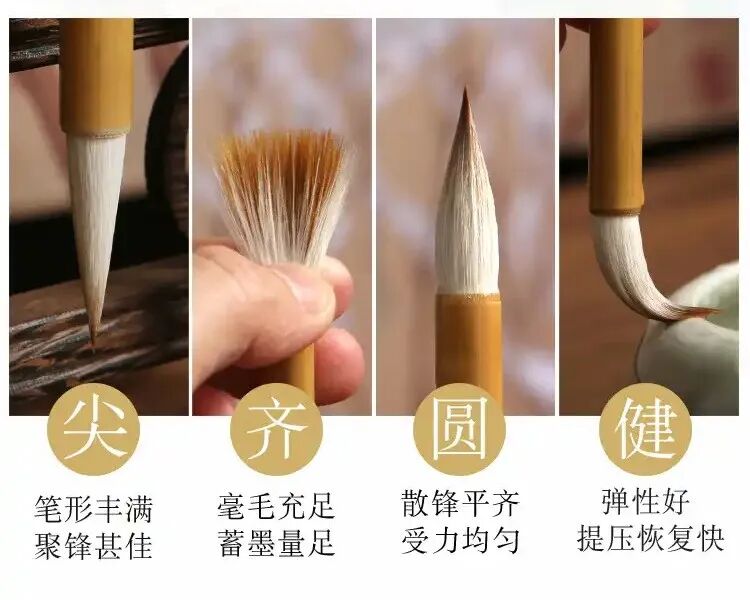 好的毛笔应具备尖、齐、圆、健的特征,称之“笔之四德”。
