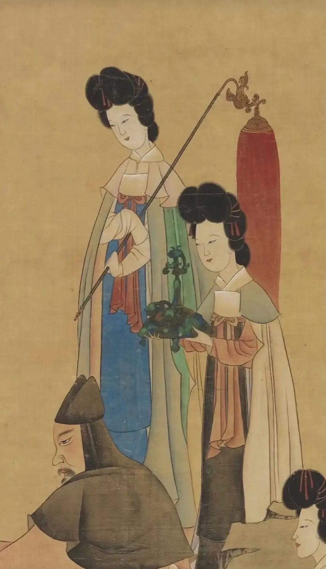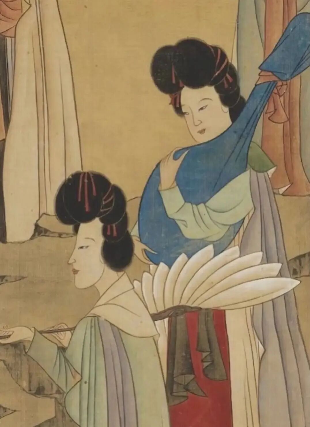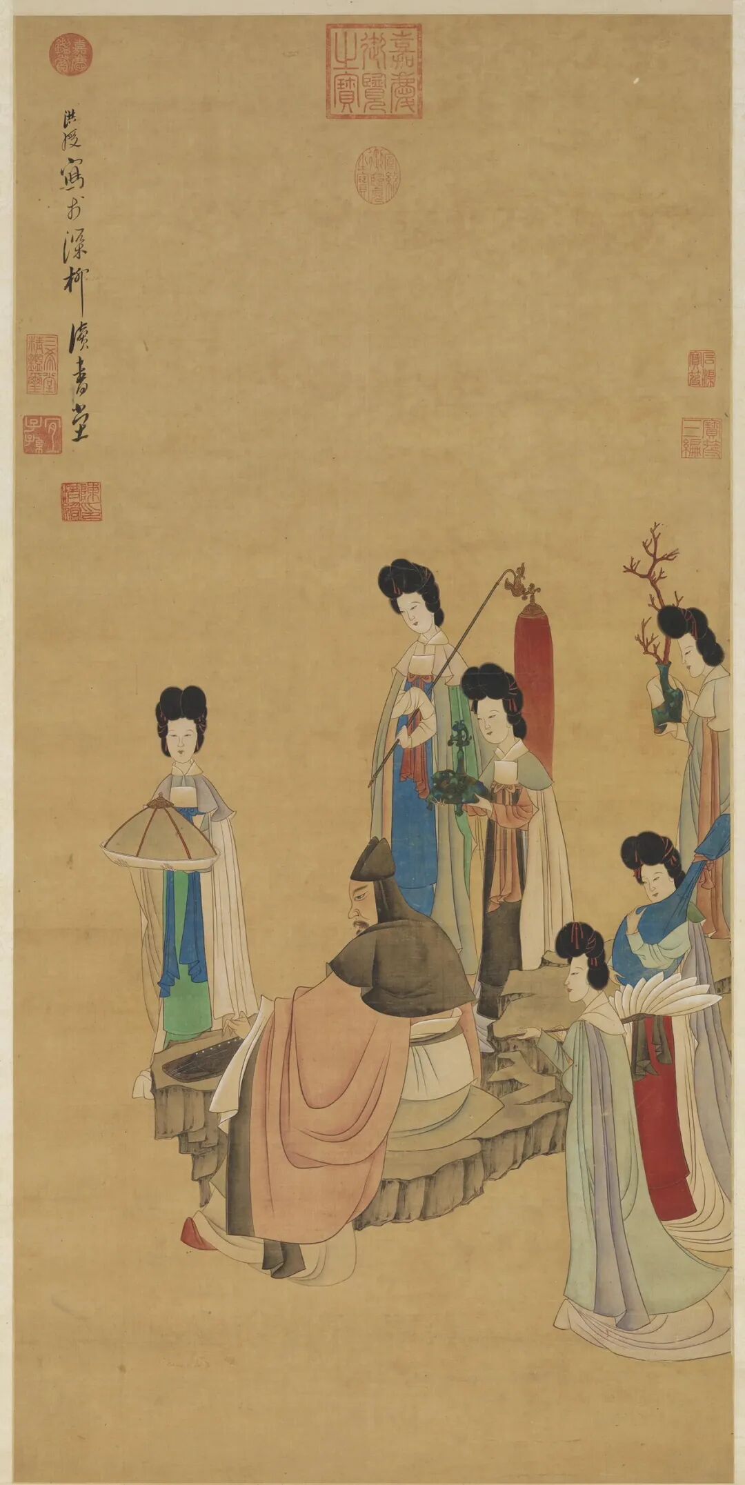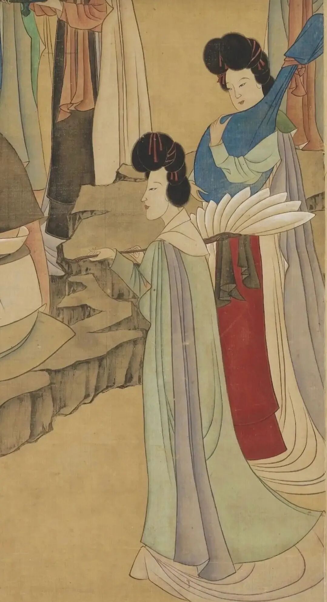 这幅是他人物画里的经典风格,线条细而有力,画面上的士人身着巾服坐一磐石上抚琴,有仕女六人侍立三边,由前至后,一捧盘,一执红拂,一捧香炉,一捧内插珊瑚的古瓶,一抱阮,一持白羽扇。仕女们梳着高高的发髻、身着色彩不一的披风,服饰线条简约、配色雅致,让人不由得赞叹这样的服饰即便放在现在依旧令人艳羡。