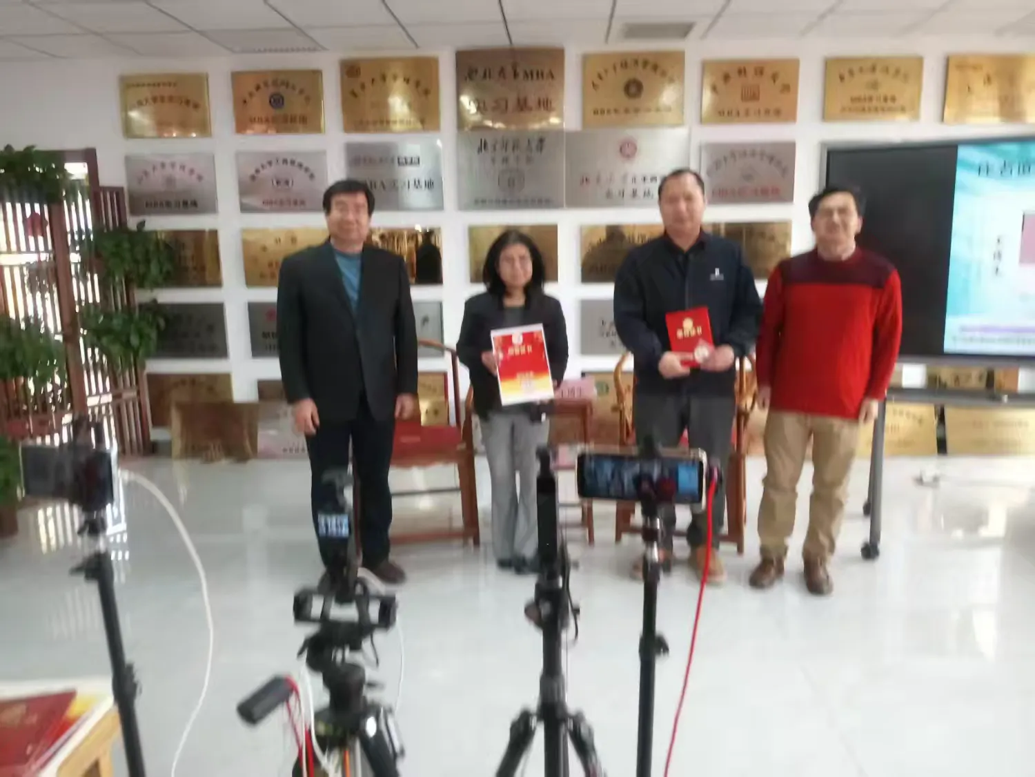 分享会还进行了颁奖,多项荣誉逐一揭晓,为现场氛围注入满满正能量。首先,为荣获第九届中国书画春节联欢晚会全国书画大赛书法金奖的马文章、李淑刚颁奖,作者面对面发起人王璞先生与北塔先生上台,为获奖者颁发荣誉证书,肯定其在书画艺术领域的深耕与成就。随后,揭晓人人门户网2025年度网络作家称号,朱鸿博获奖者脱颖而出,乡土诗人网总编张浩先生、著名诗人绿岛先生为其颁发证书,鼓励他们在网络文学创作道路上继续深耕不辍、再创佳绩。荣获第九届中国书画春节联欢晚会全国十大书画家的赵普平女士颁奖。王博生与柴金龙共同为赵普平女士颁发奖杯、证书与奖章,以表彰其在书画艺术领域的杰出贡献。现场,赵普平女士还带来了精心创作的国画作品《国色天香》《龙行海洋》,并将作品郑重赠送给中国书画春晚组委会及作者面对面组委会,用笔墨传递对文化传播事业的支持与祝福,赢得现场嘉宾的阵阵掌声。颁奖结束后,王博生向作者面对面发起人王璞赠送了军旅书法家刘建武的书法作品《守正创新》,以笔墨寄情,传递对文化传承与创新的追求。现场为各位嘉宾发放福字与《梅兰竹菊》作品集。