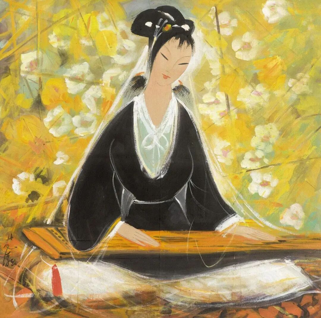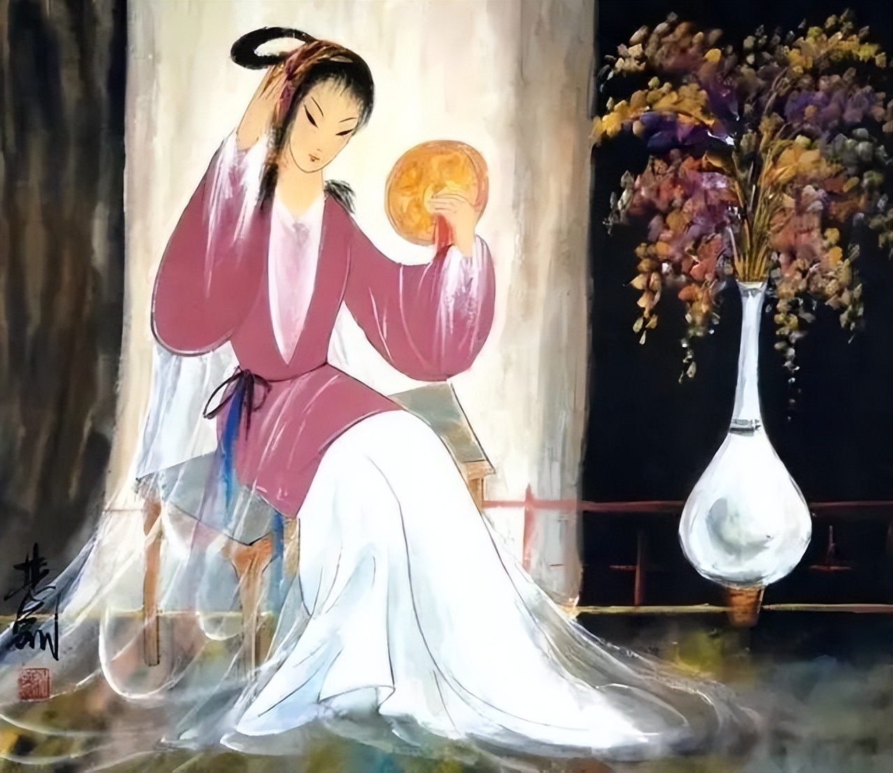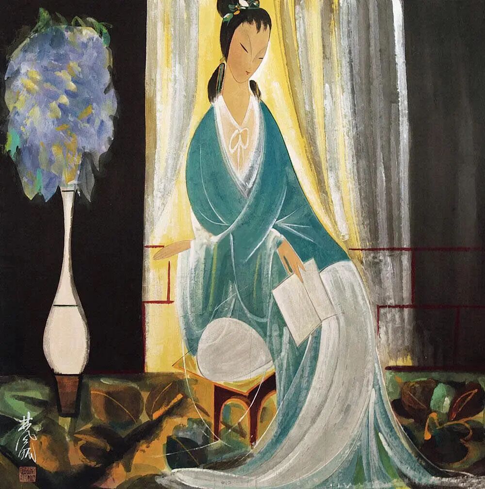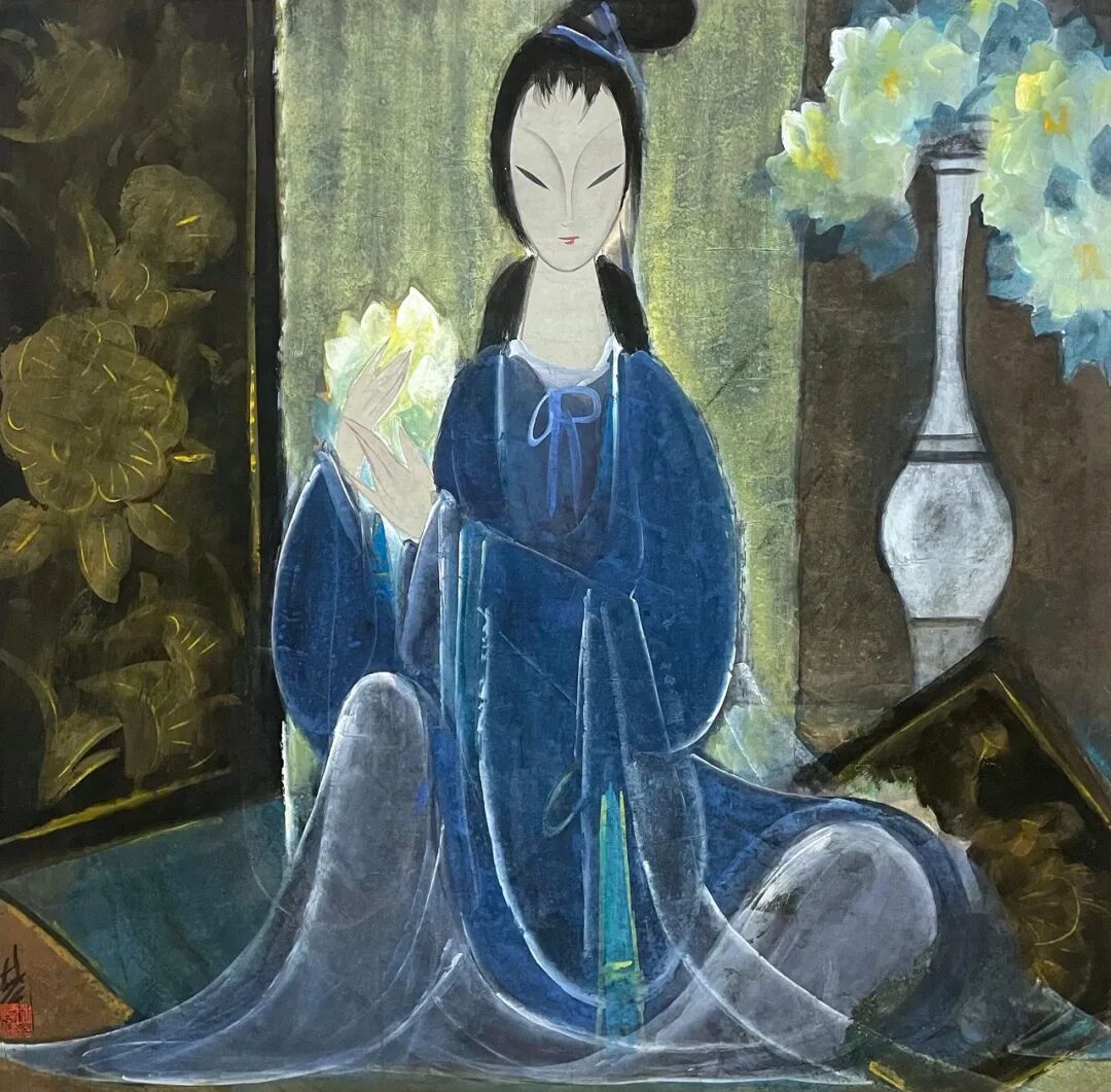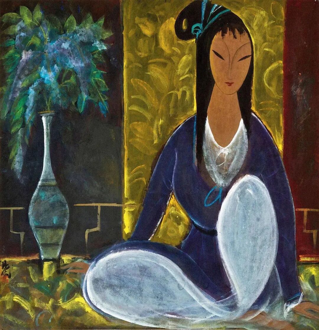 林风眠笔下的仕女,总带着一抹挥之不去的幽微情愫。她们眼眸轻阖半眯,似蒙着薄纱的月光,藏尽未言的心事;唇角平直无波,不见半点笑意,却将千回百转的愁绪凝在眉梢。那抹淡淡的忧伤,不浓烈却绵长,像江南烟雨中的薄雾。