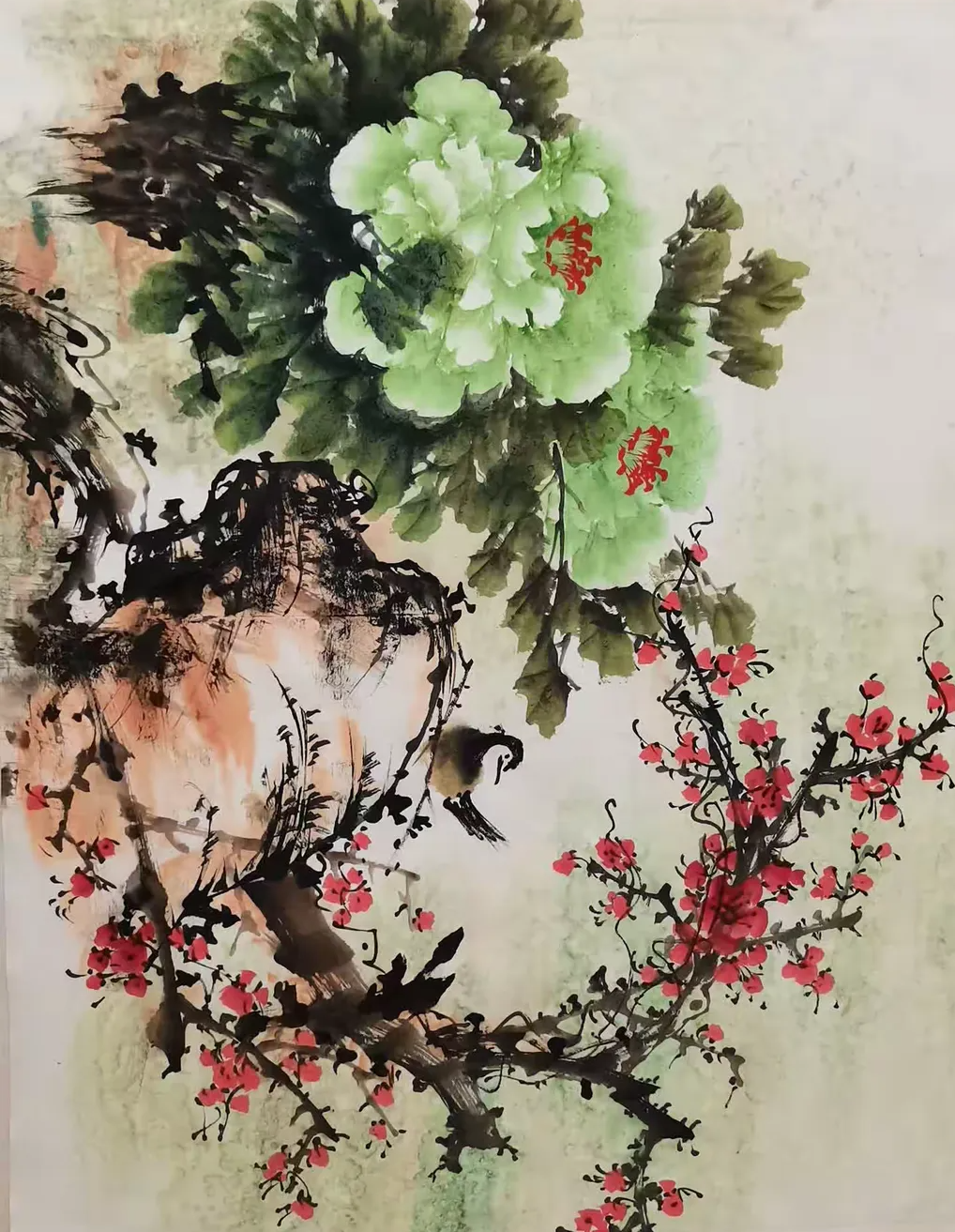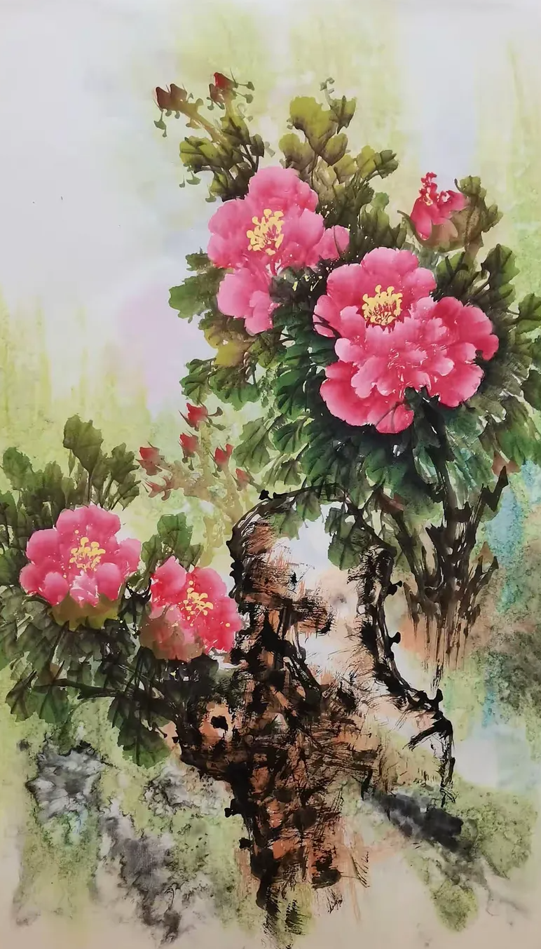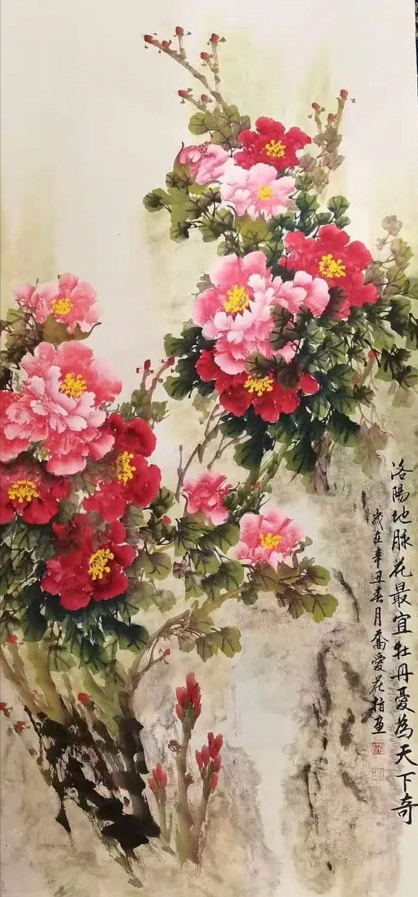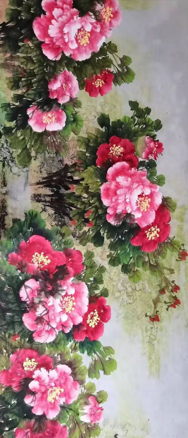 Introduction of the PaintressQiao Aihua, a native of Luoning County, Henan Province, is a noted Chinese finger paintress, and a Country-level first grade artist,also an inheritor of intangible cultural heritage and member of a council of China Painting and calligraphy Association,being invited as a special artist by both China Century Altar Art Museum and Jiangsu Chamber of Commerce.Qiao Aihua was born in 1950 and lived in a poor peasants’ family in mountainous area of western Henan Province. As a child she was unable to go to school because of poverty, but liked drawing very much,particularly good at drawing peony and plum blossom. As a very little girl, she started pasturing cattle in the hills and doing farm work in the farmland with her father. She was so good at watching and appreciating the various and graceful bearing of flowers and plants whenhaving a break. When she was only seven, she started to draw tree branches and wild grass on plane rock with a sharp stone. At the age of twelve, she learned to draw plum blossom on the land ridge using tree branches. Enlightened and inspired by her father, she started to try drawing peach and plum blossoms and peony flower on the waste cloth and silk using her fingers when she was 22. At the age of 40, fortunately under the guidance of Mr. Wang Chengxi, a great master of painting plum blossom in our country, Qiao Aihua’s inspiration burst out and her thought of composition of a painting was greatly expanded and her skill of composition advanced rapidly. Then, Qiao successfully facsimiled the Master’s great works of plum blossom,and was sincerely appreciated and praised by the Master himself. By and by, under the conception of dexterously utilizing the flow direction and tendency of the Yellow River, Qiao succeeded in painting a finger painting titled The First Plum Blossom Under Heaven that shock the painting industry. In November the same year, she drew a painting called Spring Coming With Peony and Plum Blossom, which was praised and top rated for two varieties of excellent blossom in one painting and both colorfulness and plainness in one show. It was also the first time for her to draw such a painting that was top rated and collected with a long price by foreign friends. Afterwards, the quality of her painting was bettering continuously and novelly and skillfully conceived works emerged endlessly.Nearly over two thousands of her wonderful works were published and collected by about a hundredpainting lovers, including some state and provincial or ministry leaders , some great masters, professors of the painting circle, scientists of aerospace, notable hosts of CCTV, well-known film stars and some foreign friends.In March 2015, Qiao was appointed as an academician of Qingfeng Painting and Calligraphy Academy of Henan Provence. Her large-scale painting Drawing of Peony was enshrined ceremoniously by the PLA stationed in Luoyang during the 70th anniversary of the victory of the Anti-Japanese War. In September 2016, Qiao’s finger painting works was intended to be nonphysical cultural heritage of Xigong District, by the Government of Xigong District, Luoyang City, Henan Province. In October, 2016, Qiao was formally absorbed into the Council of Painting and Calligraphy Art as a member of China Intangible Cultural Heritage Protection Alliance.In February, 2018, Qiao’s studio named Henan-Luoyang Ai-hua Studio was formally identified as the cooperator of China Century Altar Traditional Culture Season by the Administration Center of China Century Altar with her finger painting works being the permanent collection of China Century Altar Art Museum. Her finger painting works titled Long Scroll of Luoyang Peony had the honor to win first prize of art category among Henan Provincial Painting and Calligraphy Works Exhibits, during the theme activity titled “Eulogizing the Centenary Anniversary with Painting and Calligraphy” equivalent to “Celebrating of the Centenary of the Chinese Communist Party” inSeptember 2021.