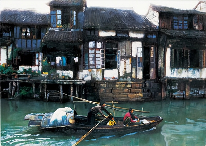 【赏析】陈逸飞运用他擅长的细腻浑厚的笔法,描绘了一个颇具生活气息的场景—日暮归渡的渔船上一家三口,临岸的民居在精心摹画下泛着水乡特有的润泽,白墙、黑瓦、石阶,与前景中的渔家人物融合无隙。尽管是写实的,陈逸飞依然赋予了这个平凡的瞬间以诗性的节律。作于1984年。