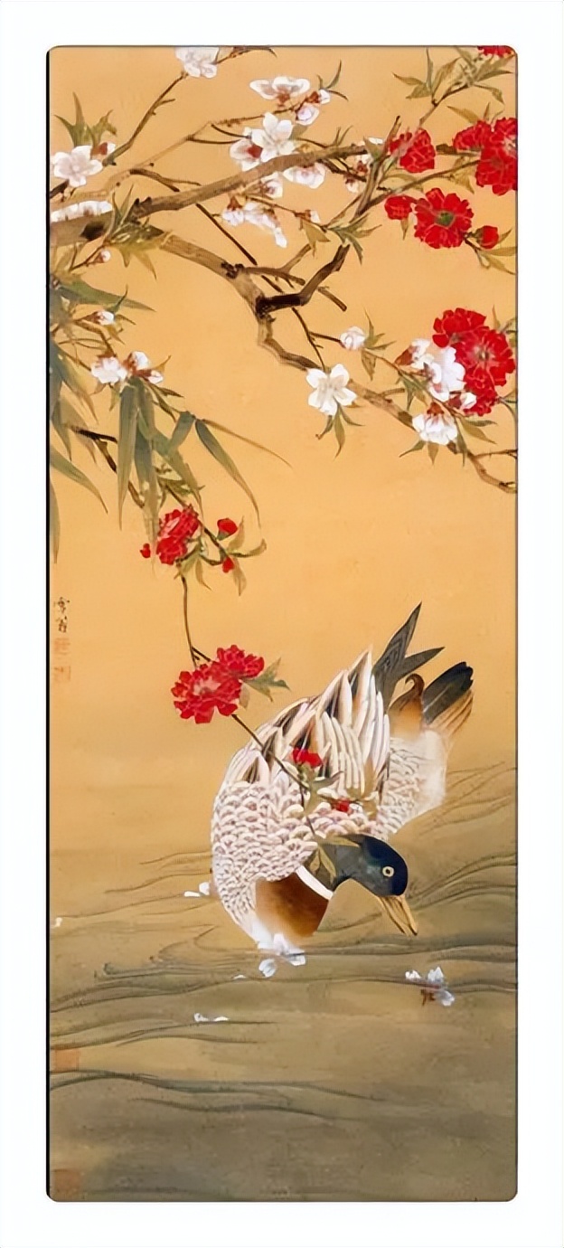 【赏析】《春江永暖》画中点点桃花,红白相间,前后相映,几枝摇曳的绿竹,穿插其中,更显出桃花的娇艳。一只色彩斑斓的花鸭,悠然自得的嬉戏在流水中.追逐着飘落的花瓣,一派生气盎然的景象。此幅作品用独特的艺术语言充分地表达了”春江水暖鸭先知”这句脍炙人口诗句的意境。