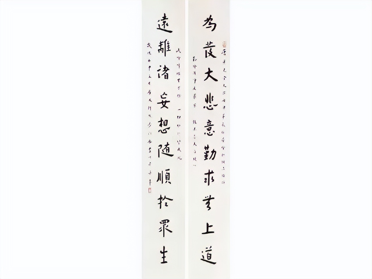 此联为李叔同出家后的典型书体。圆润含蓄的线条,疏朗瘦长的结体,稚拙中带些赢弱,蕴藉和谐、兼疏淡远,是大智若愚、大巧若拙的境界。