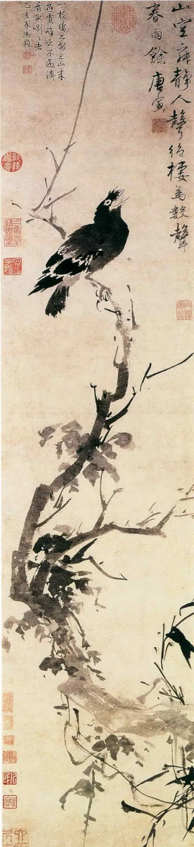 【赏析】画中以大笔没骨涂染,塑造了一只栖息枝头、昂首鸣春的鹤鹆的优美形象,神态活灵活现,呼之欲出。树身以飞白写出,盘藤则用水墨阔笔。画面错落有致,神韵飞扬,为唐伯虎传世之精品。