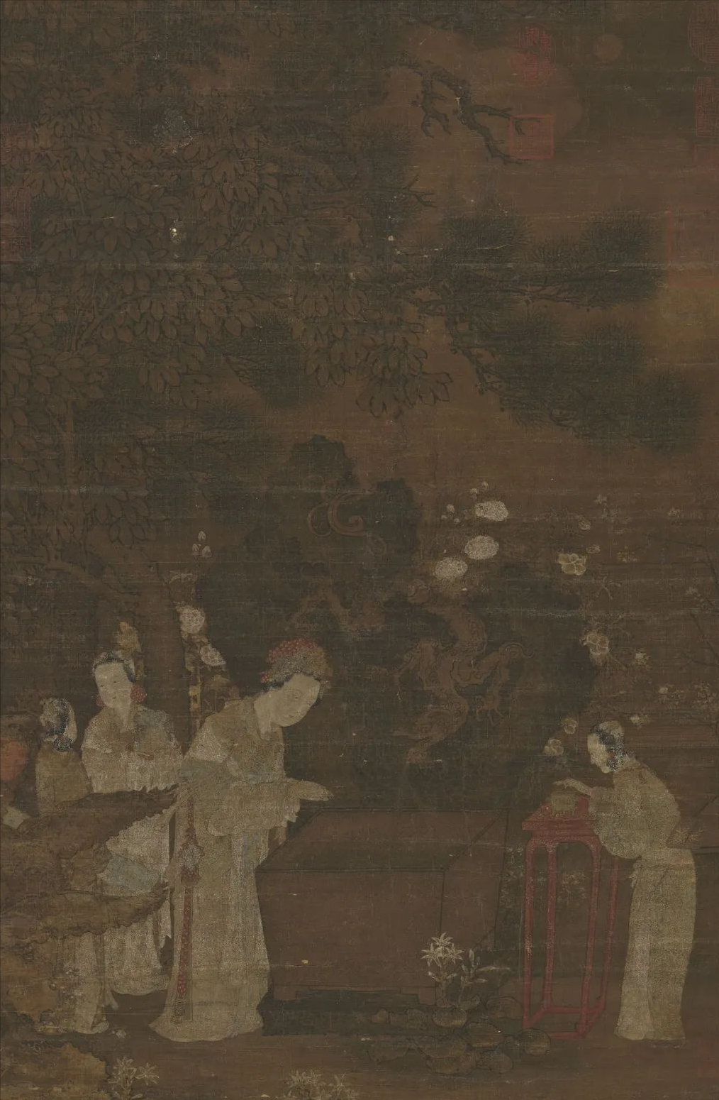 明·文徵明《中庭步月图》,南京博物院藏。在中国传统绘画中,以文人月夜访谈为主题的创作并不少见,此图为代表作品之一。画面表现了画家与来客小醉后于秋天庭院中赏月话旧的雅会,寂静而明亮的月光,携无限情思,于画面之上浮现,并赋予中国画以新的图像内涵——与现实生活很近的亲切和悠闲。这也反映了当时士人高雅的生活情调,具有广泛的代表性。明中晚期,苏州地区发达的经济、市民阶层的兴起、相对宽松的社会氛围,让文士的生活愈加清雅而闲适,园林、家居等意象成为此时文人画自觉表现的主题。