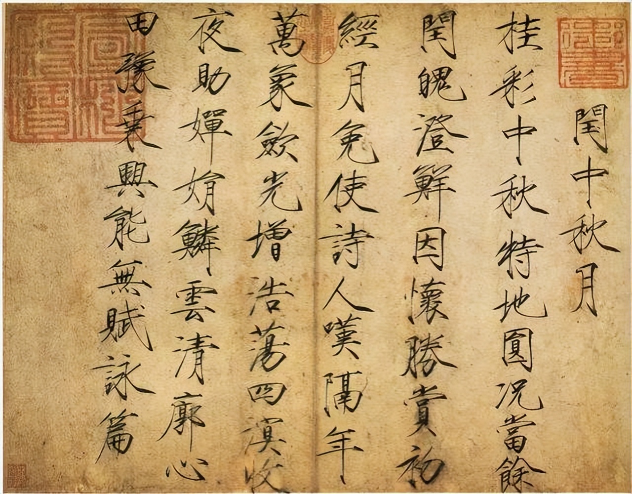 宋·米芾《中秋登海岱楼作诗帖》(简称《中秋诗帖》),日本大阪市立美术馆藏。《中秋诗帖》为宋代米芾据王献之《十二月割帖》的不完全临本,原帖在“中秋”之前还有“十二月割至不”六字。为米芾所藏,后刻入《宝晋斋法帖》。此帖行书3行,共22字,释文:“中秋不复不得相还为即甚省如何然胜人何庆等大军。” 无署款。