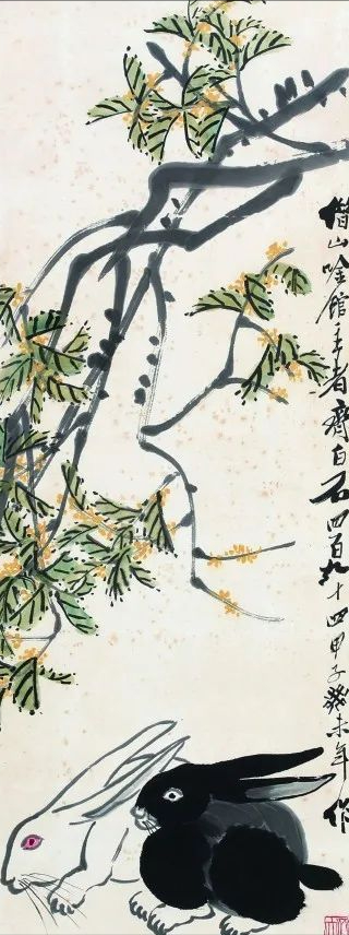 近现代·齐白石《丹桂双兔》图。历代文学作品常将玉兔喻为明月,有“金乌西坠、玉兔东升”之说。这幅图为齐白石罕见画兔题材的作品,他以兔及中秋时节的桂花,来表现中秋时节的特色。作品构图错落有致,墨色酣畅,叶脉与怒放的桂花相映成趣,意在营造一种中秋雅趣。相关的意境,亦见于齐白石的《中秋清饮图》。