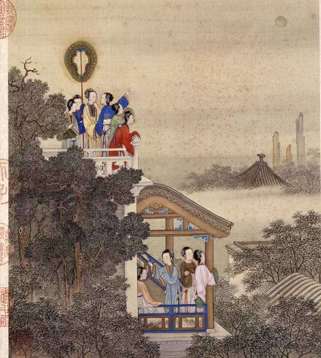 清·陈枚《月曼清游图》之“琼台赏月”,故宫博物院藏。《月曼清游图》册描绘的是宫廷嫔妃们一年12个月的深宫生活,作者在人物创作的审美取向上以明代唐寅、仇英笔下的仕女画为审美标准,追求秀润飘逸的情致。此幅《琼台赏月》图描绘了描绘中秋之夜,贵妇们聚集高台,吟诗赏月的情景。《月曼清游图》册,清,陈枚绘,绢本,设色,共12开,每开纵37cm,横31.8cm。此画册落款“臣陈枚恭画”,钤“臣枚”印1方。每开均配有清代梁诗正的行草体墨题,款“乾隆岁在戊午秋九月朔臣梁诗正敬题”, 戊午为乾隆三年(1738年)。钤清高宗弘历“乾隆御览之宝”、“古希天子”、“乐善堂图书记”等印共60方。