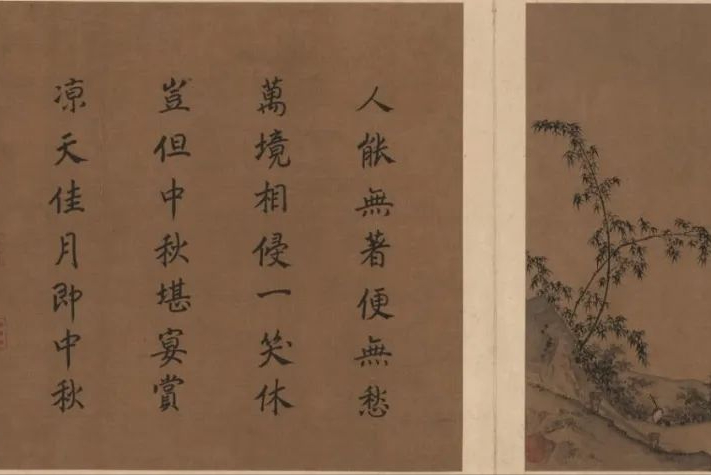 宋·马远《月下把杯图》,天津博物院藏。该作品体现了马远山水画独特的风格:变五代、北宋以来的全景式山水画为“截取式山水”,取边角小景,小中见大,世称“马一角”,虽非大山大水,却意象精微,韵味悠远,体现了马远在两宋山水画风转变上所做出的贡献。这件作品笔力劲利硬朗,构图简洁有力,画面右上题诗“相逢幸遇佳时节,月下花前且把杯”,其后亦有楷书“人能无着便无愁,万境相侵一笑休。岂但中秋堪宴赏,凉天佳月即中秋”。
