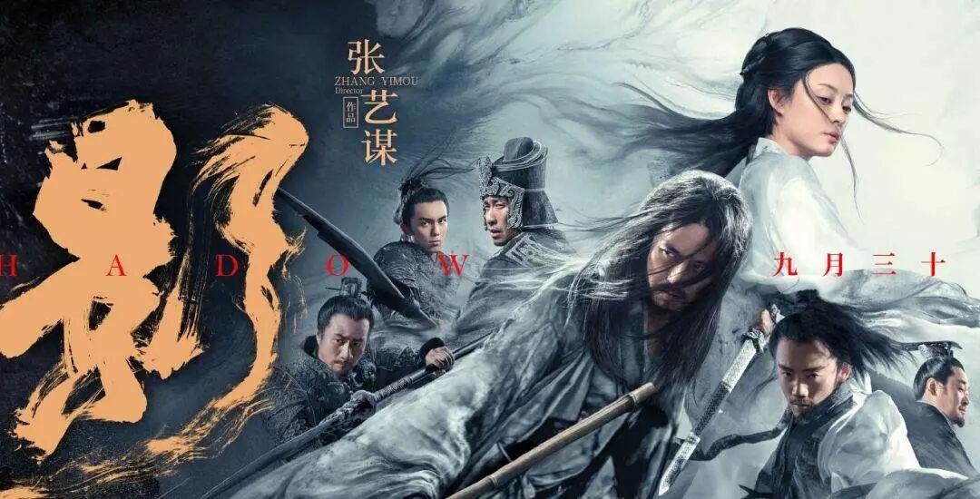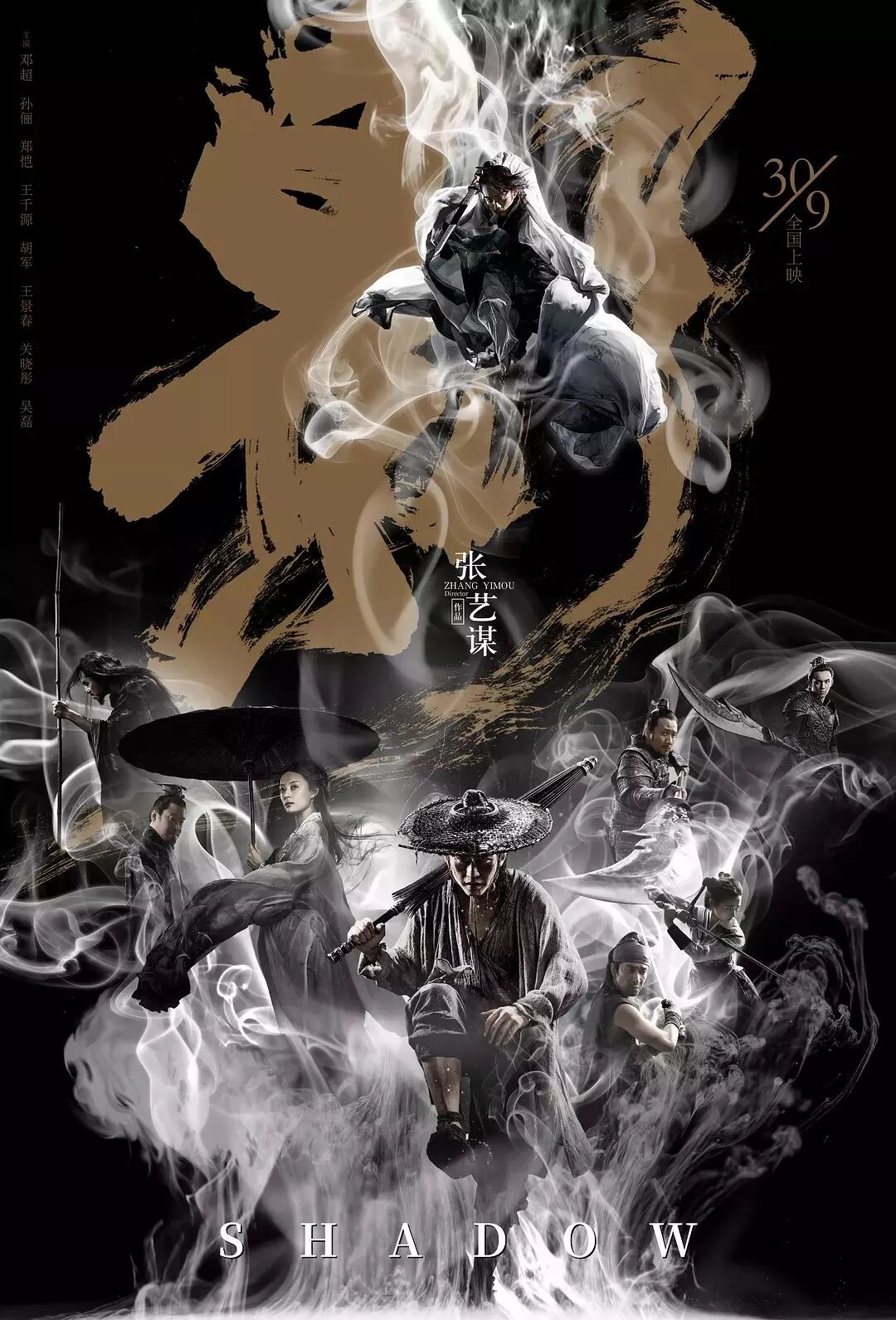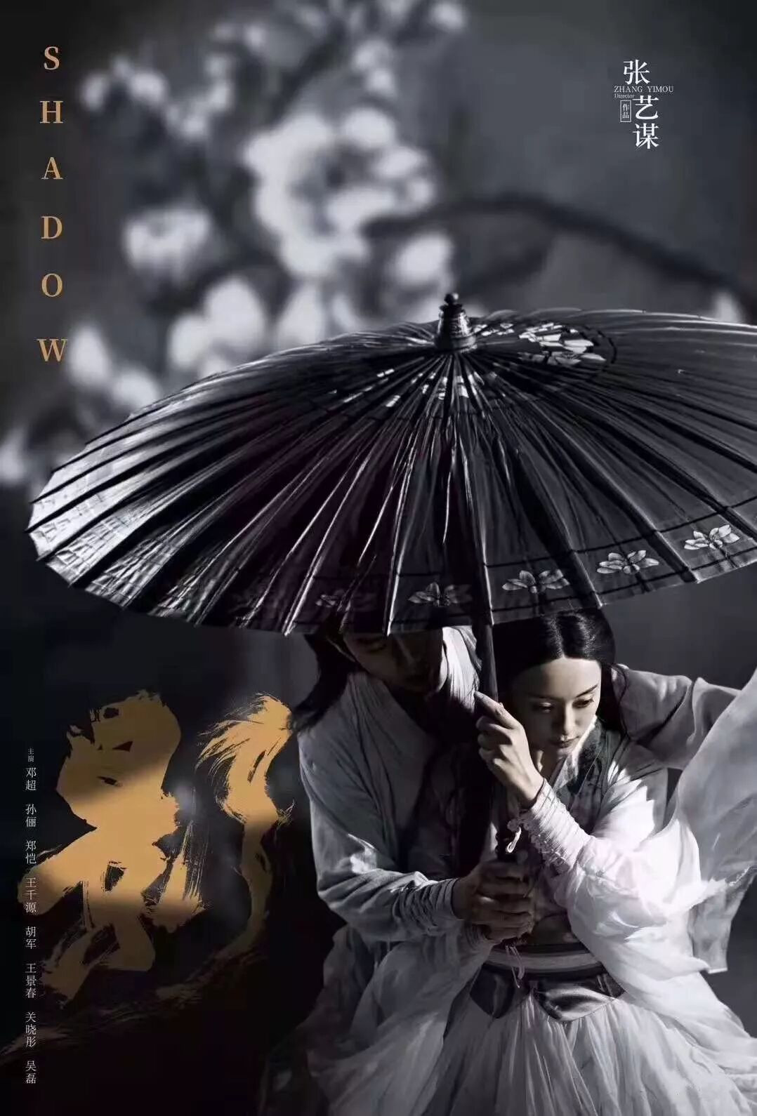 海报中的水墨黑白流淌,太极图,油纸伞...中国元素尽显姿彩,“影”字如飞舞的流云,笔锋挥洒,飘逸的剑气释出,仿佛透露着与影片有关的丝丝风声。