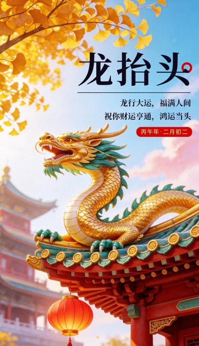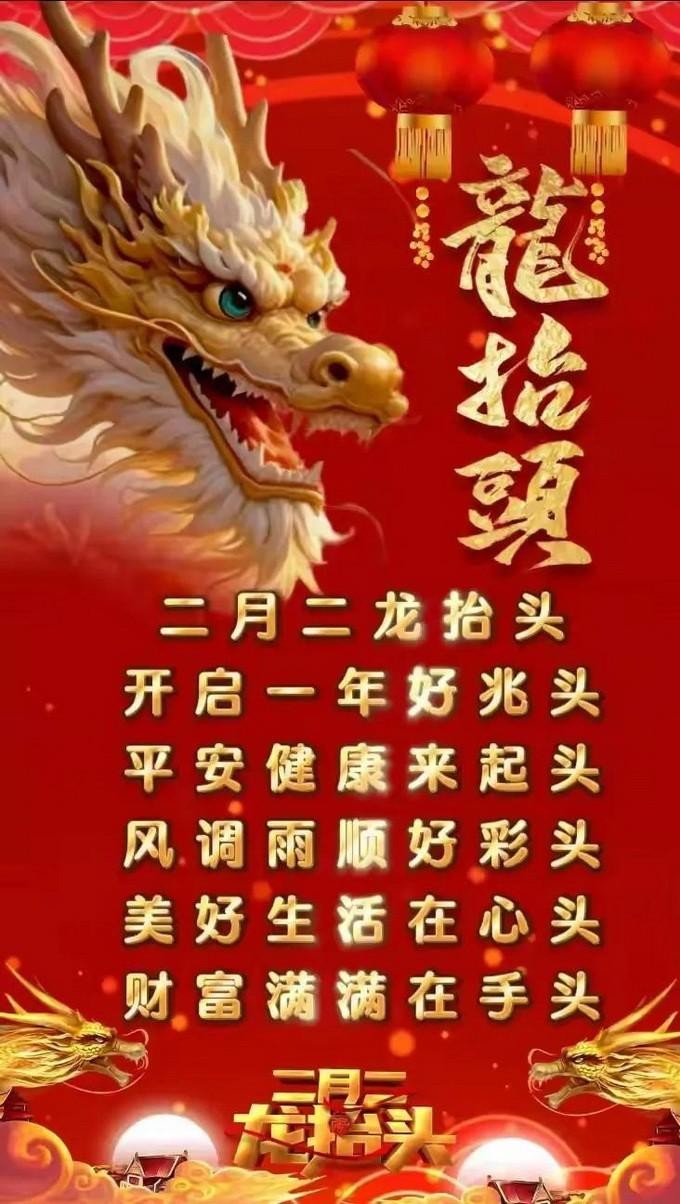[摘要] 二月二龙抬头,幸福吉祥,好运来!事业兴,刚开头;日子好,有奔头;爱情美,到白头;生意旺,赚彩头;前程宽,有奔头;幸福留,驻心头;财滚滚,金进斗;心情好,乐悠悠;体康健,无烦忧;事遂愿,特顺溜;大步走,不回头;步步高,争上游;恭祝您,情长久,运长久,福长久!