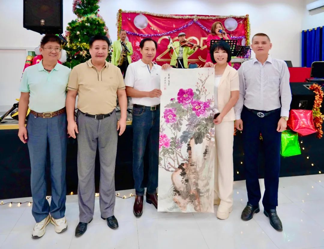 颇钦(中间)、宋继兰(右2)、萧国刚(左2)、李诚(右1)、李新文(左1)与宋继兰佳作《花开富贵》合影留念宋继兰向颇钦阁下赠送了中国画《花开富贵》,象征中泰两国兴旺发达、盛世图腾。