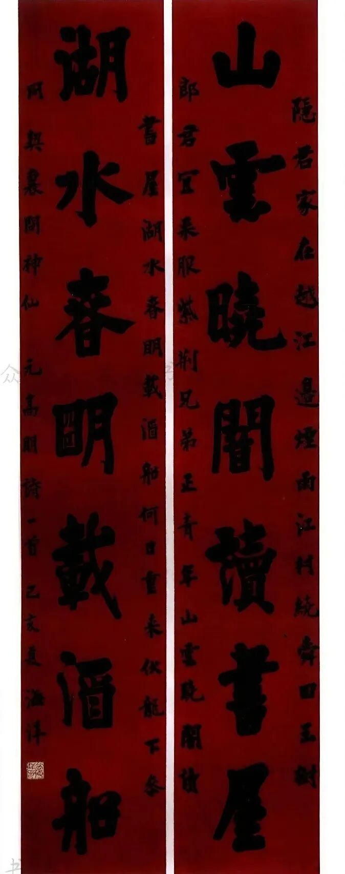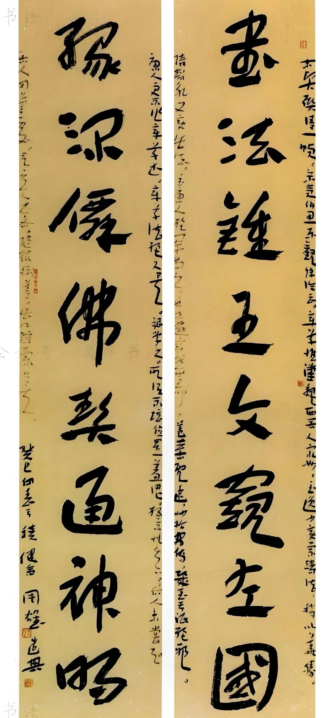 [摘要] 中国书法艺术的长河中,对联这一独特形式犹如一颗璀璨明珠,以其对称之美、意蕴之深、书写之妙,成为文人墨客抒发胸襟、展现才情的重要载体。历届国展中获奖入展的30副书法对联,更是凝聚了当代书坛的创作精华,映照出传统艺术在新时代的生机与活力。这些对联作品首先在内容上呈现出博大精深的文化内涵。或取法经典,从《诗