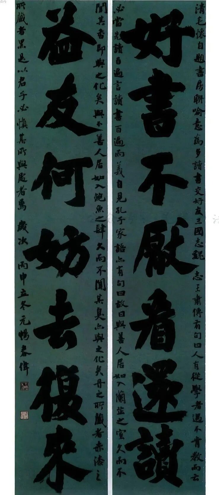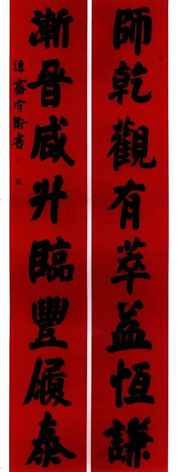 这些对联作品首先在内容上呈现出博大精深的文化内涵。或取法经典,从《诗经》《楚辞》到唐诗宋词,字字珠玑;或自出机杼,抒写时代新声,句句含情。如一副获奖行书对联“得好友来如对月,有奇书读胜看花”,既承袭传统文人雅趣,又暗合当代精神需求,在古雅中见新意。另一副隶书作品“海纳百川有容乃大,壁立千仞无欲则刚”,以雄浑笔力书写千古名句,彰显出胸怀天下的气度与风骨。
