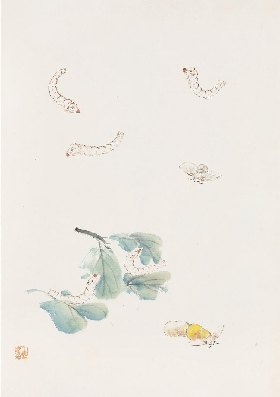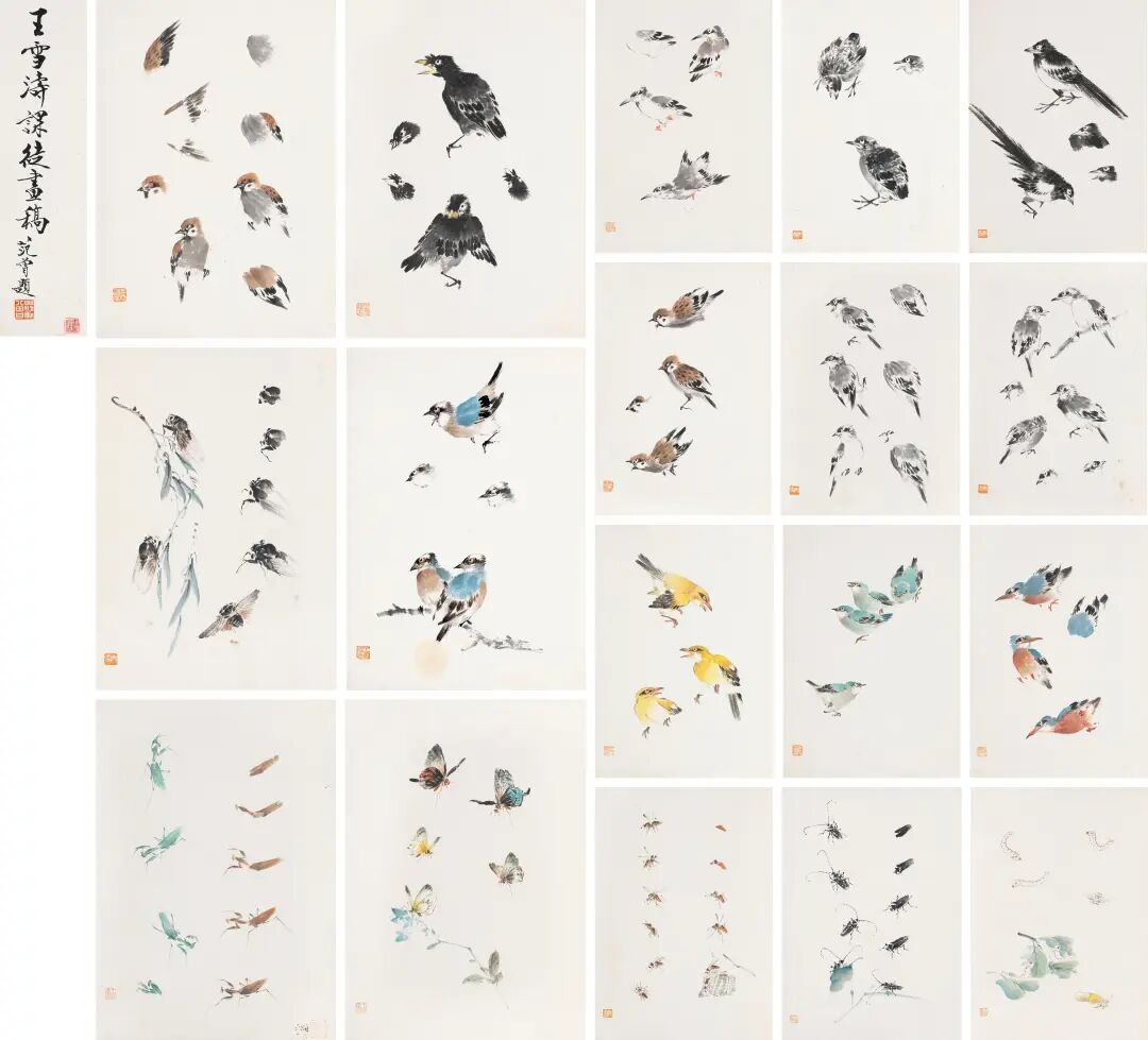 《课徒画稿册》是王雪涛教学实践中的重要作品,共十八开,其中十二开为禽鸟画法示范,六开为草虫画法示范。禽鸟部分涵盖麻雀、八哥、喜鹊、鹌鹑、翠鸟、黄鹂、白头等常见鸟类,草虫部分则有蝉、蝶、蜂、天牛、螳螂、蚕等昆虫画法。此册非寻常创作,而是为传授画艺而绘制的示范画稿,集中体现了他的艺术理念与教学方法。