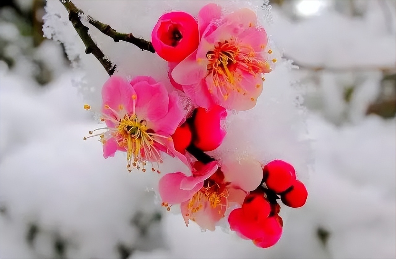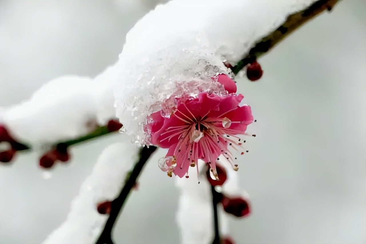 “已是悬崖百丈冰,犹有花枝俏。”寒冬腊月时,百花凋零,唯有梅花还孤傲地怒放于冰雪之中.