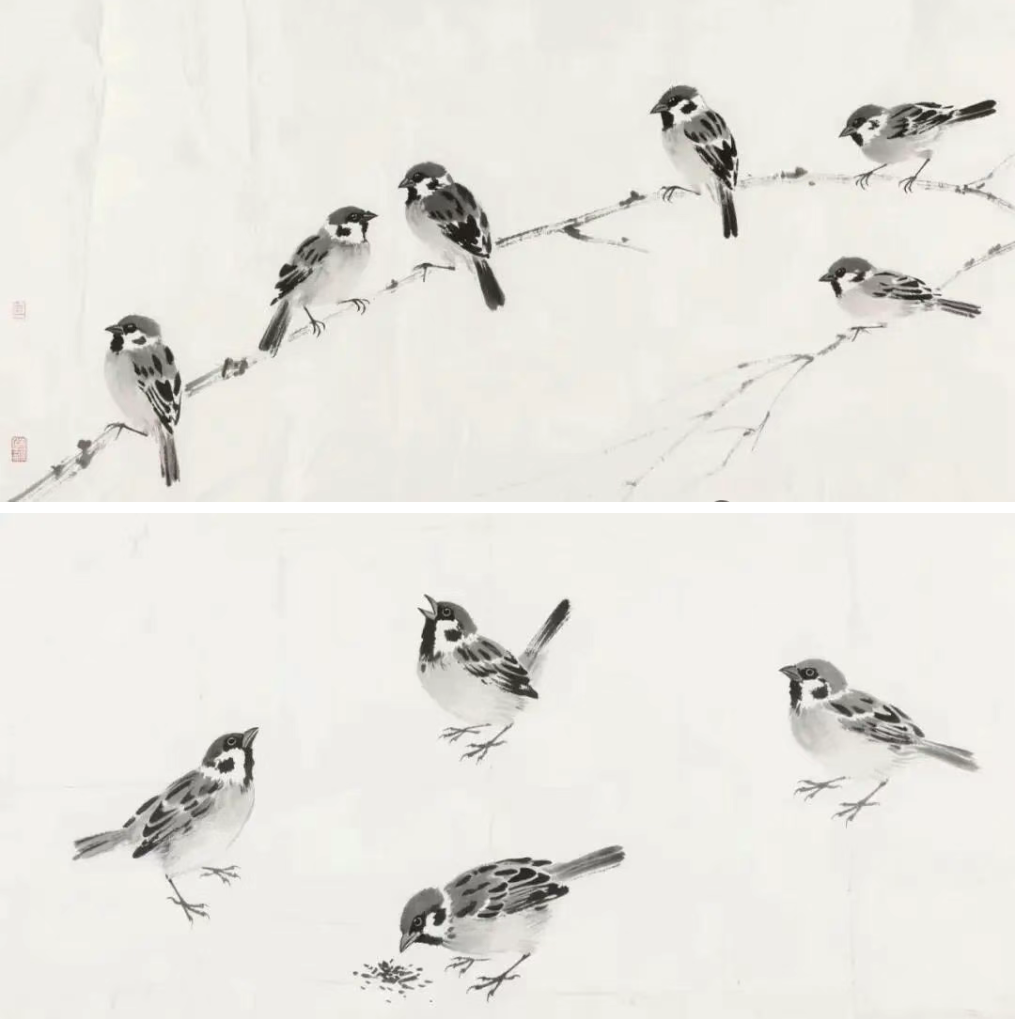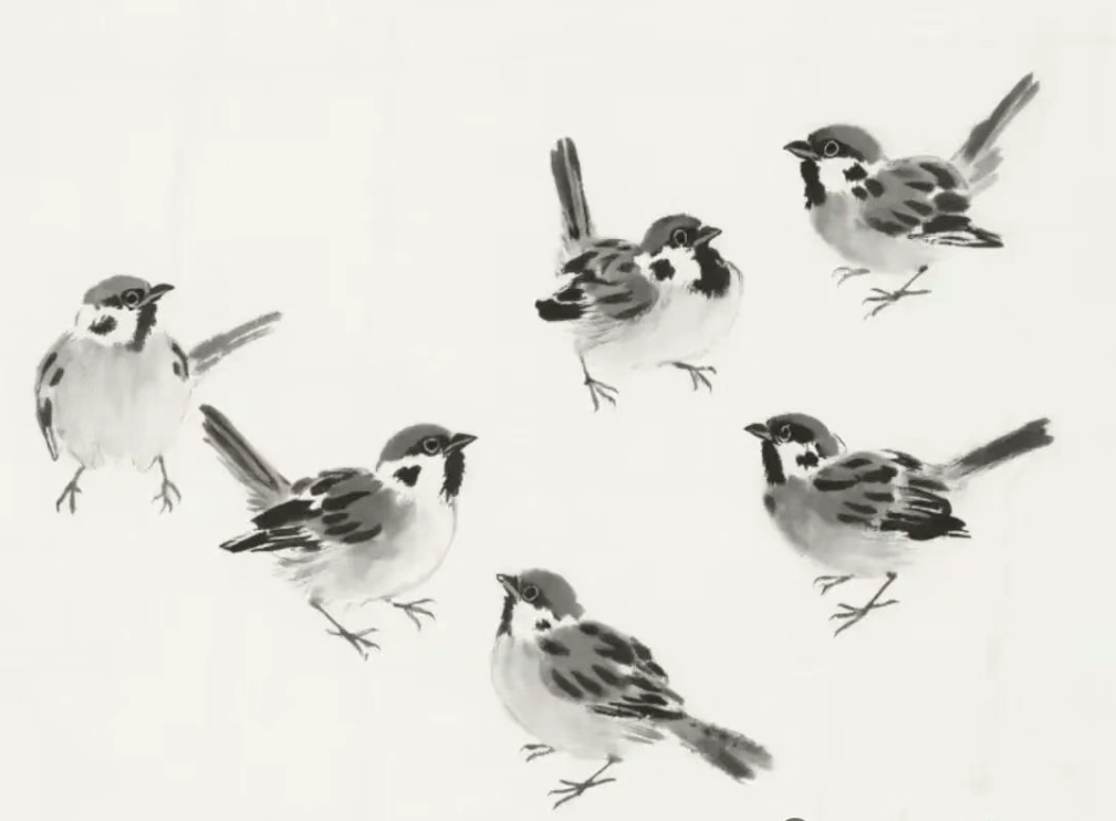 试着画几只不同姿态的小麻雀,让它们在画面中相互呼应,相信你一定能感受到水墨绘画的乐趣,让这灵动的小麻雀为你的画作增添独特的魅力。