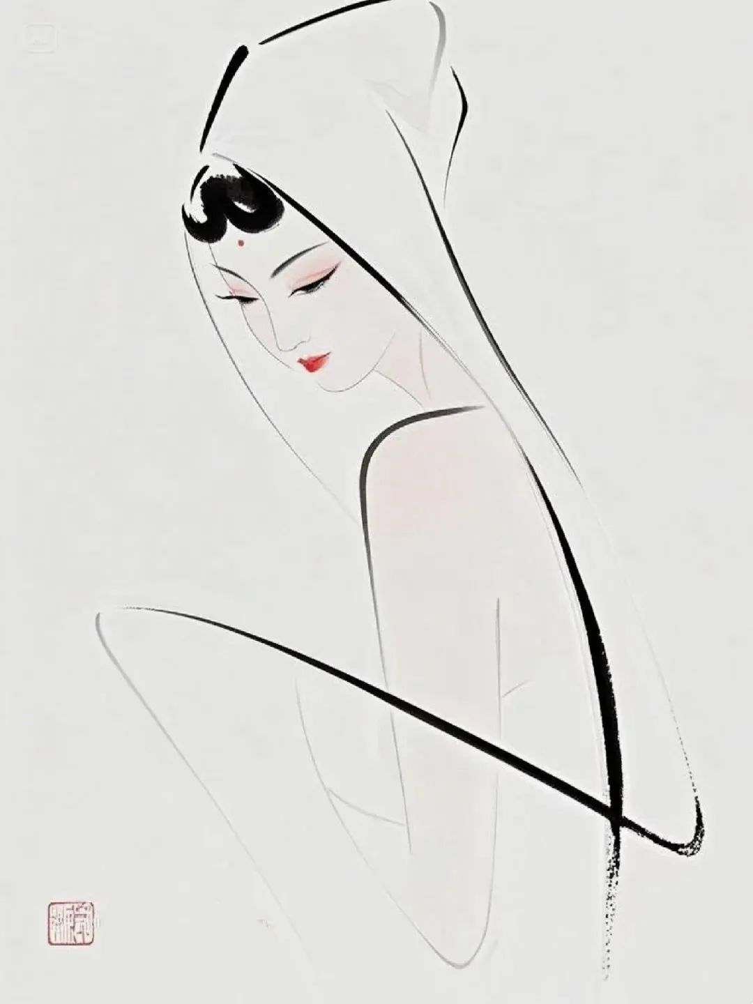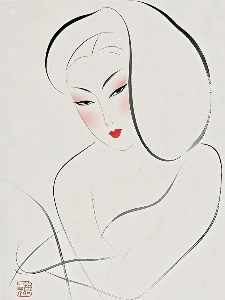 眉眼间未作过多雕琢,仅用几笔淡墨勾勒轮廓,却通过线条的虚实转折,透出几分清澈与温婉,那是一种无需言说的女性之美,含蓄而绵长,在线条的流转中静静流淌。