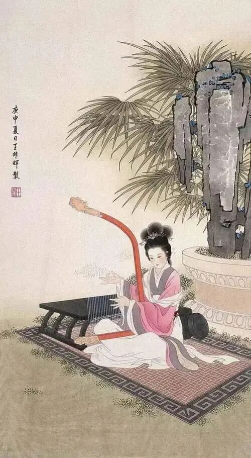 弹箜篌是古时高门贵女的一项常见的活动,箜篌配美人,高贵又典雅。