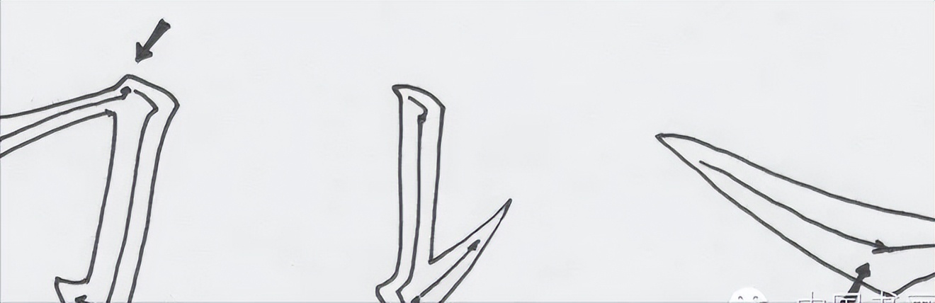 二是用在出锋的地方,先以迅疾之笔作按势,借急按的反弹之力弹起笔锋。如悬针,长撇就应这样用笔,悬针和撇的中后段常常显出丰腴之态,就是借势出锋用笔的自然结果,其它捺、挑钩也是这样重按而提出的。