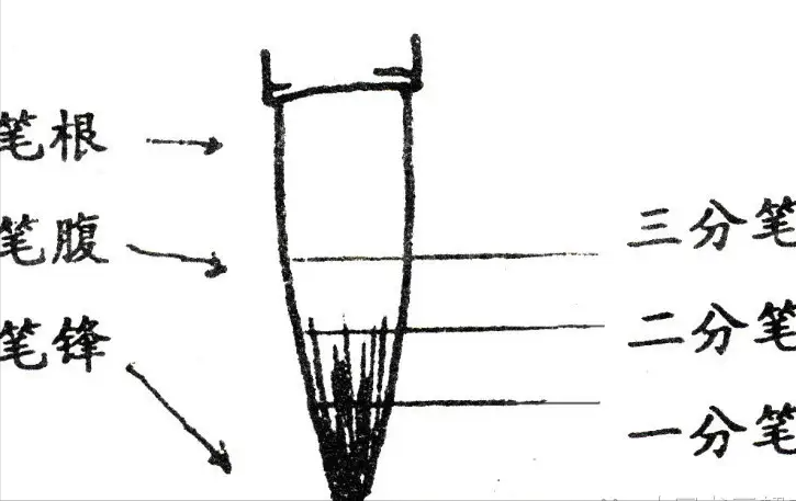 [摘要] 三、保持和恢复笔毫的弹性弹性物体都有个弹性限度的问题,在一定力的范围内,弹性物体可迅速恢复原状,超过限度。弹性破坏难以复原。毛笔性柔,弹性是很有限的,这要求我们:三分笔示意图1、控制毛笔下按的程度:一般要在笔头一半以内,向来有一分笔,二分笔,三分笔的说法,用意即在使用近前端的笔锋,笔锋变形程度小,易于