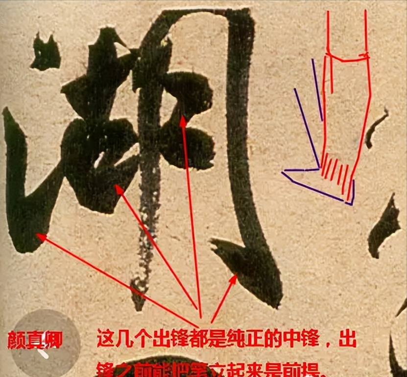 关健是能够“立锋”运笔,笔锋立起,不专门倒向哪一边,“锋正则四面势全”,这时无论走向哪个方向都得中锋。所以,凡顿笔后,(不管在起笔或在运行中段)均要尽力将倒下的笔锋撑立起来,要撑起笔锋,要领是两个字——“回顶”(古人著述中常见的回锋、挫锋、蹲锋、驻锋等,都是指把笔回顶一下,用劲的轻重深线有别而已),是运笔中最要紧的技术动作,是功力的标志,掌握之后,很多运笔问题都以此迎刃而解。