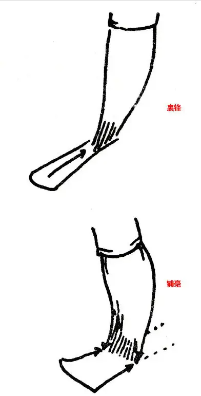 裹锋:运笔时笔管前倾,笔毫被顺拖着走,笔锋自然地向中央收拢,线条中实两边略虚,如刘熙载《书概》中说:“徐弦小篆,画之中心有一镂浓墨正当其中,至于屈折处亦当中,无有侧处,盖得蔡中郎遗法也。”写楷书的长横、篆书、连绵草等细劲而圆的笔画常用这个方法。