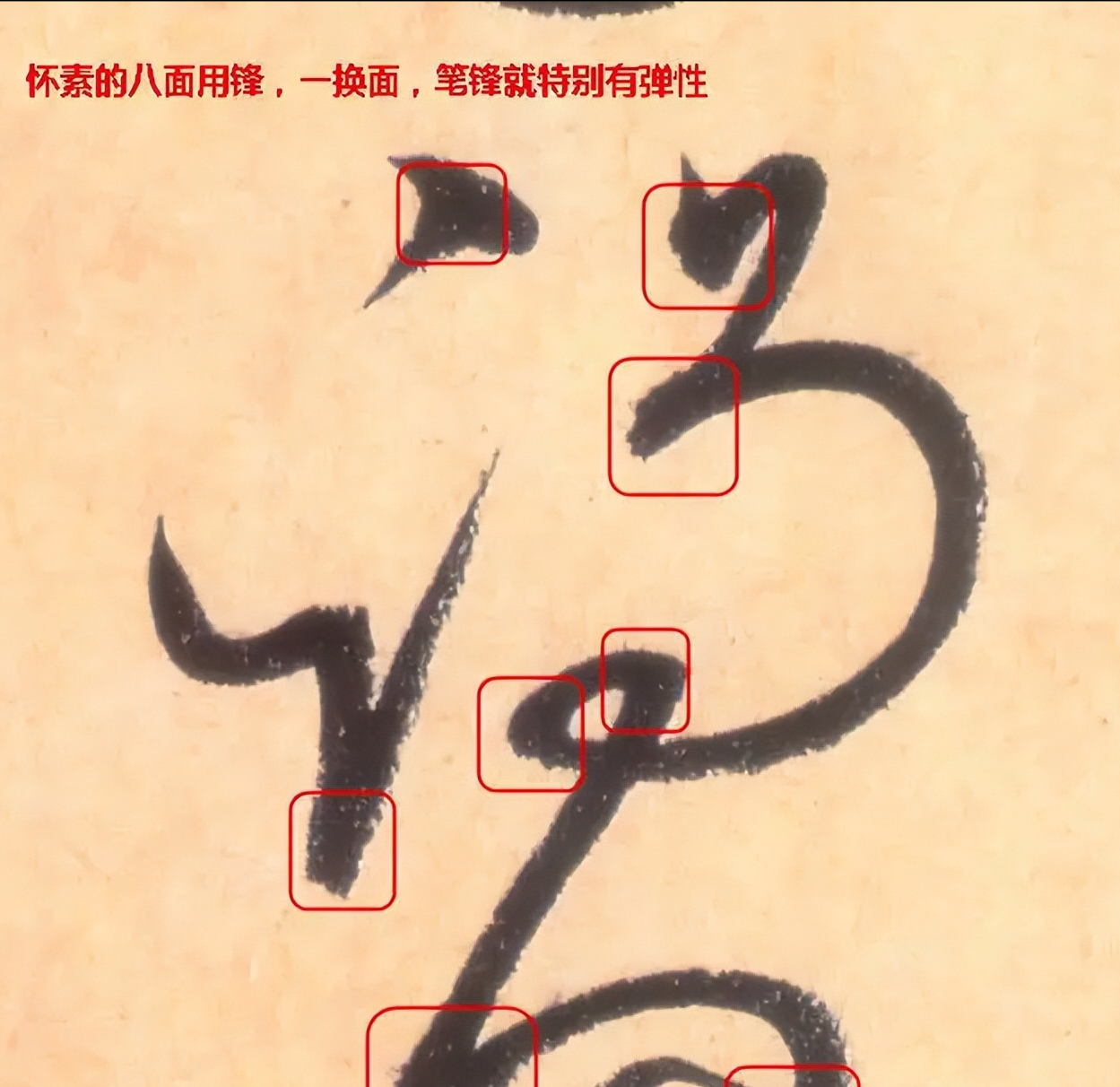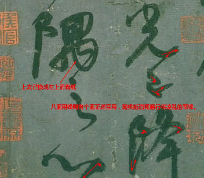 另外,有人为八面出锋,就不是遵循中锋运笔的原则了,这是对八面出锋的误解和对中锋的片面理解。很明显,八面出锋有利于在笔画换向时保持中锋。