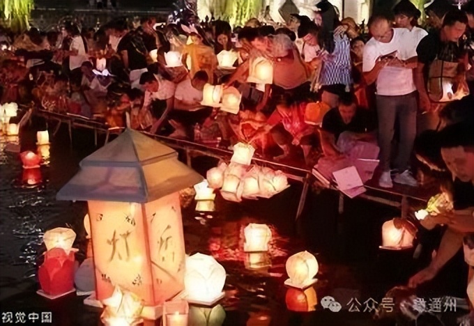 其次为放河灯:放河灯有这么几个意思,旧说法,七月十五是秋气新来阴盛之时,天地府洞开,鬼魂四出,“七月半,鬼乱窜”。有祀者,回家接受子孙的祭拜,无祀者,人们会请佛道做法事“普度”,毋使孤魂野鬼,流浪为害。祈求河神保佑不要淹死人;纪念亡故亲友;祈求风调雨顺、国泰民安。放河灯的习俗据说由上元张灯而来,民间认为上元节是人的节日(也称“人节”),要张灯结彩喜庆元宵,而中元节是“鬼节”,为鬼庆祝节日也应张灯。但是,人鬼有别,人为阳,鬼为阴,陆为阳,水为阴,所以上元节张灯是在陆地,而中元节张灯是在水里。因为灯可“照幽冥之苦”,故又称“照幽冥”、“照冥”或“照幽魂”。河灯,也称“荷灯”, 最初的河灯确以荷花或荷叶做成,后来则用纸做成莲花形代替,插上蜡烛或放上纸捻的灯花,燃点成灯。后用瓜皮、面碗、纸张、木板等各种材料做成灯具。通州多河富水,放河灯的地方当然很多。《燕京岁时记》载:“运河二闸,自端阳以后,游人甚多,至中元日,例有盂兰盆会,扮演狮子秧歌诸杂技,晚间沿河燃灯,谓之放河灯…………。”《京都风俗志》载:“带梗荷叶者,谓之荷叶灯。晚间,小儿三五成群,各举莲花荷叶之灯,绕巷高声云:‘莲花灯,莲花灯,今天点了明日扔’。或以短香遍粘蒿上,或以大茄满插短香,谓之蒿子灯,茄子灯等名目,此燃香之灯,于暗处如万点荧光,千里鬼火亦可观也。”凉水河、潮白河等都放过河灯。通州老坑居多,也为放河灯提供了条件。我到漷县镇采访,漷县镇村民云:放河灯在漷县镇西黄垡村曾经很是流行,西黄垡村西有一条河从村边流过,村子当中四坑相连……自制河灯用彩纸糊成莲花,下面用半个西瓜皮或掏空的茄子等作底托,把纸莲花扦在上面,中央插上蜡烛或纸搓的灯花蘸油,夜间点燃放河中任其漂流。据说,这是祈求河神保佑不要淹死人。放河灯时也有吹歌,给热闹场面增加欢乐气氛。放河灯的习俗解放后就少有了。1986年,通县文化馆拍摄电视片《运河组歌》在西海子公园放过河灯。有荷花灯、西瓜灯、自制的“龙灯”等。1990年7月,西集镇在潮白河畔举办消夏晚会。岸上篝火熊熊,载歌载舞,河里,河灯闪烁,亮亮晶晶。潮白河畔沉浸在欢乐之中。关于放河灯,通州还有一段传说故事。说很早以前,通州城闹瘟疫,满城都是黑蚊子。14岁的小姑娘荷花不辞辛苦日夜兼程请来神灯灭蚊,通州人造燃灯塔将神灯挂在塔尖上,神灯照亮了整个通州城。大黑蚊子(瘟疫)灭除了,百姓欢呼雀跃,荷花姑娘却因过度劳累,含笑而死。那天正是七月十五。爷爷痛哭着,把她安葬在渡口旁,为她修一座坟茔。姑娘的名字叫荷花,她生前又最喜欢荷花,为了纪念她,感念她的功德,每年七月十五,人们都默默地来到运河边,有的用纸做成荷花,有的用西瓜皮,有的用鲜荷花。上面放上点燃的蜡烛,做成无数盏荷花灯放在运河里。看到荷花灯人们仿佛看到了正在摆渡的荷花姑娘。这个故事很美,也很动人。表达了通州人崇善逐恶的品德。