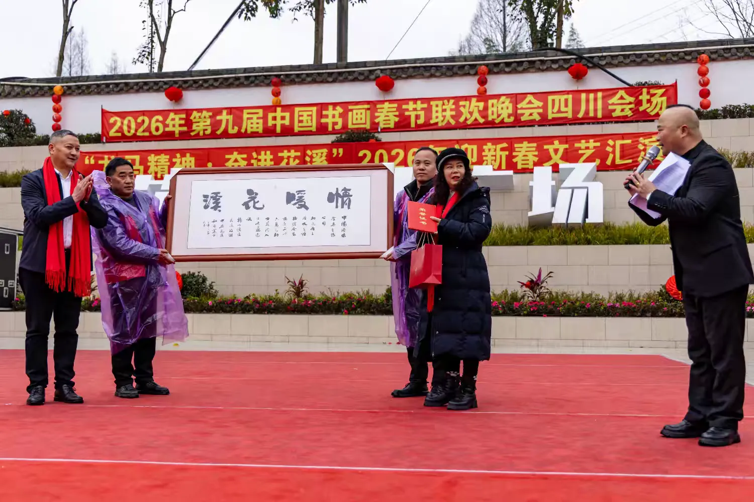 中国书画春节联欢晚会总策划总导演王博生上台致辞,他对第九届中国书画春节联欢晚会四川会场的圆满启幕表示祝贺,对花溪社区的文化建设成效给予高度评价,详细介绍了书画春晚深耕传统文化、服务基层群众的初心使命——正如北京专场所传递的“以笔墨传承文脉、用艺术点亮文化自信”的理念,四川会场也将立足巴蜀文化特色,打造兼具地域韵味与时代风采的文化盛宴。致辞尾声,王博生代表书画春晚组委会,向四川会场赠送了军旅书法家刘建武的题字,该题字紧扣“龙马精神”主题,笔墨苍劲有力,既呼应了2026马年新春,也寄托了对四川会场文化传播工作的美好期许,引得现场嘉宾频频称赞,与现场笔会书画家挥毫、赠送作品的环节遥相呼应,彰显了书画春晚的文化底蕴。