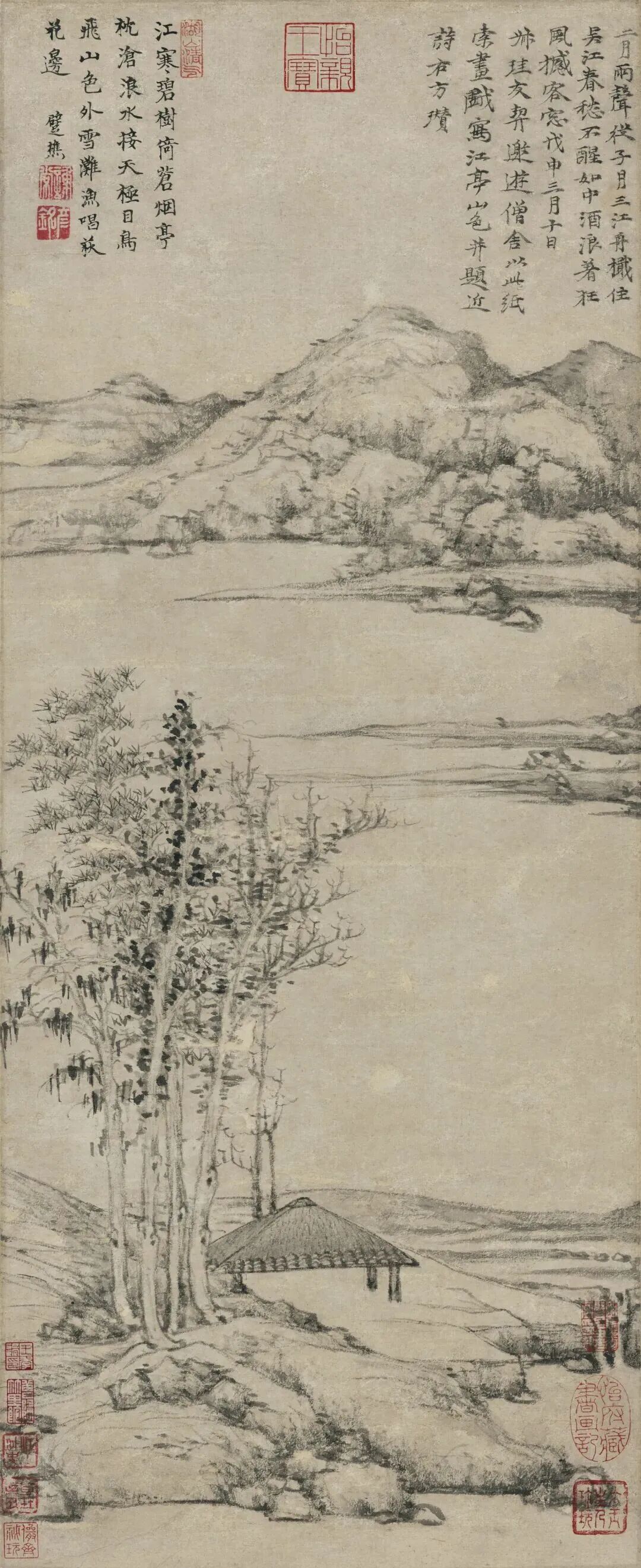 没什么争议的作品,各种媒体都已经说太多,就不重复了。作品的破损不少,可能是在王季迁的手上进行过修复,装裱比较新。值得一提的是台北故宫也有一件《江亭山色》,倪瓒在两作中都写“戏作江亭山色”,因此两作都以此命名,其实倪瓒在“江亭山色”后面并没有加“图”字,应该是泛指此图式。