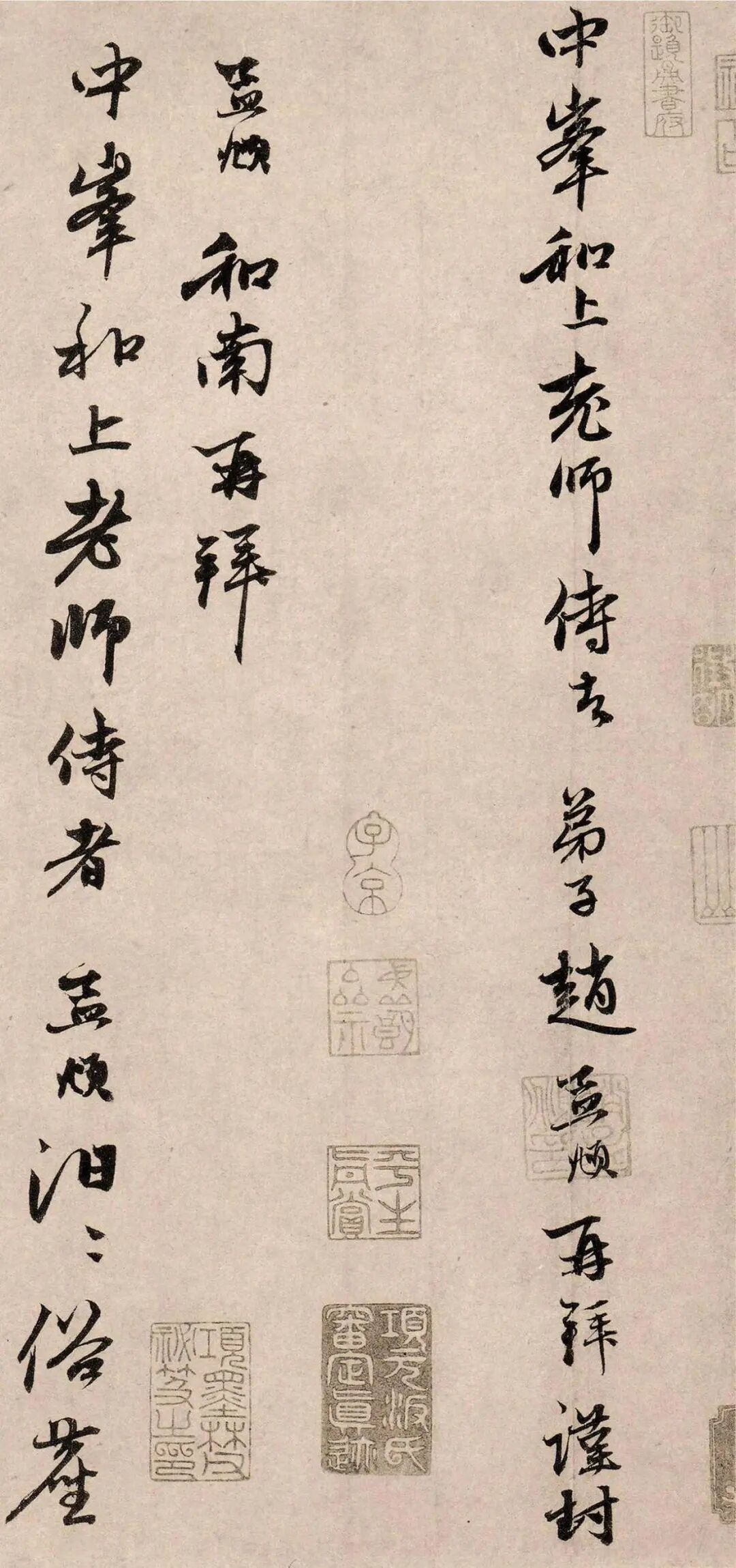 中峰和尚老师侍者。弟子赵孟頫再拜谨封。孟頫和南再拜 中峰和上老师侍者:孟頫汨汨俗尘中,每蒙尊者不弃,时时赐问,顾惟何者,乃辱过爱如此,当亦是前世有缘故耶。近一病两月,几至不起,得鲍君方调理,方赐小差,然眠食未复常,气力惙惙忧之深,至于死生之说,师所谓委顺者,固已知之矣。感师提诲,情何敢忘。蒙寄惠酒鼓,粒粒皆是禅味,敬领莫知所报,阿孙回,草草道谢,春深犹寒,山中当益甚,唯珍重珍重,不宣。孟頫和南再拜,廿四日。至侍者,前蒙惠药,甚济所乏,冀为道谢。